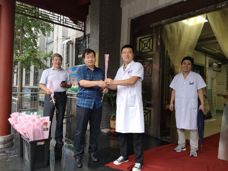 2018年8月19日是我国首届“中国医师节”。早上7点30分,院领导马登斌、王莉、李国军和医务科科长王晓敏、工会副主席李渝萍来到一楼门诊大厅,为我院医师送上了鲜花和祝福,并带队前往医院部分科室,亲切慰问在临床一线辛勤工作的医师们。
