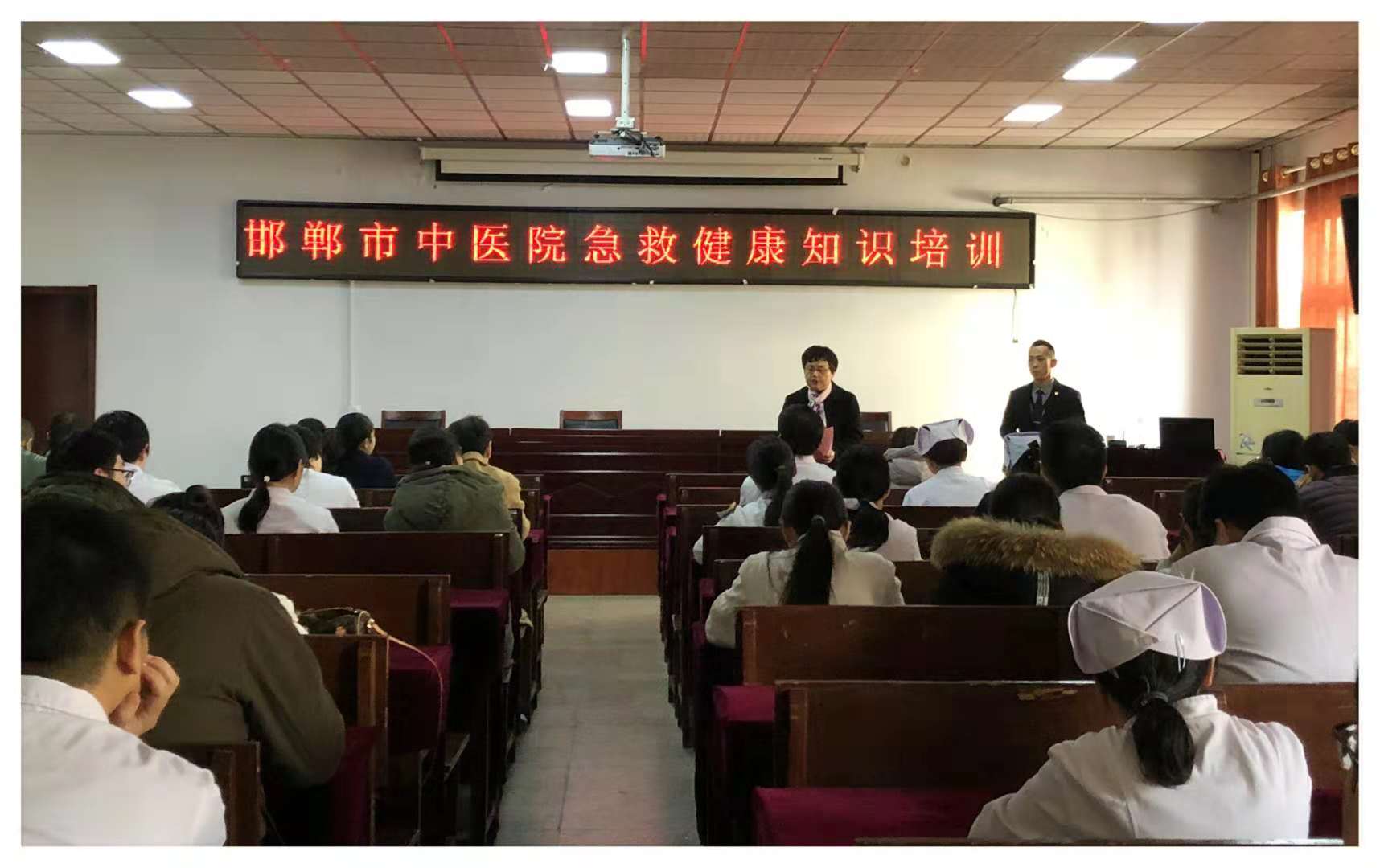 11月29日下午,我院组织全院职工在四楼会议室召开2018年邯郸市中医院急救健康知识培训。本次培训特邀中国安全健康教育中心宣教科刘向欣科长为大家授课,由王莉副院长主持。 此次培训的主题为“和谐我生活,健康中国人”。刘科长围绕日常工作、生活中可能遇到的一些突发情况,以及不良生活、工作方式引发的一些疾病,从多方面详细讲解了现场紧急救护、三减三健的健康生活方式、常见污染的防护、以及职业病的防治等方面的知识。 此次培训进一步提高了我院全体职工的健康意识。参加培训人员纷纷表示,要利用自身优势传播科学、文明、健康的生活方式,不断提升全民健康生活方式,形成人人关爱生命、重视健康的良好氛围。(医务科 供稿)
