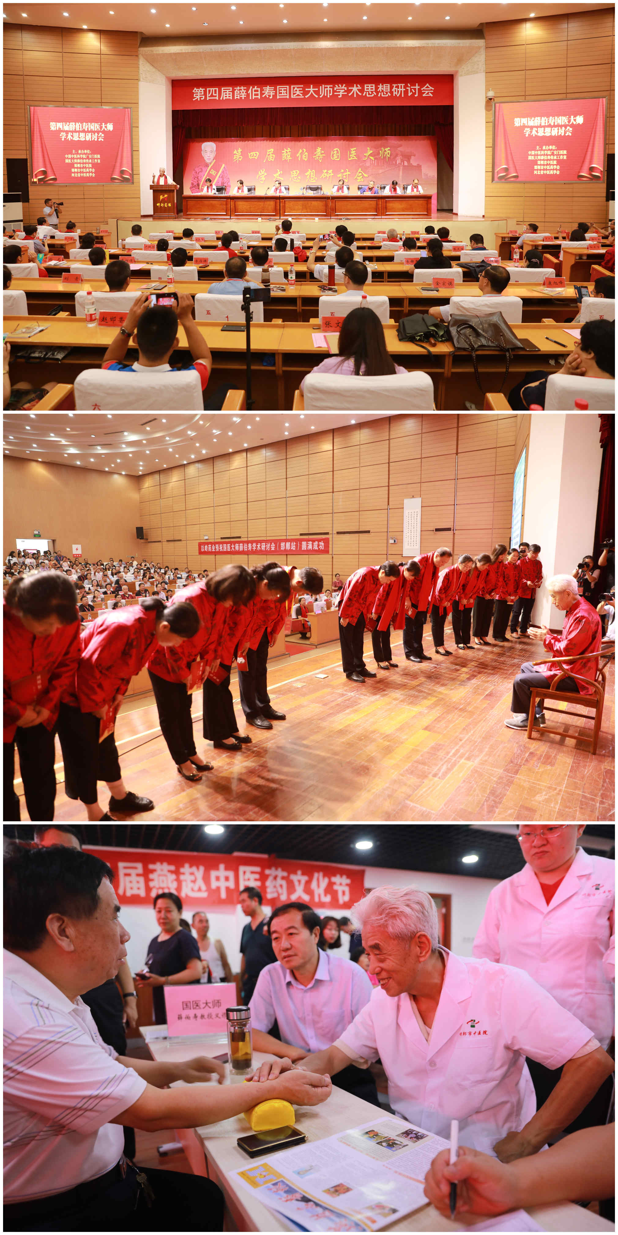8月10日,第四届国医大师薛伯寿学术思想研讨会暨第五届河北省中医药发展高层论坛在邯召开。来自全国中医学术界的代表300余人参加了本次的研讨会。 开幕仪式由中国中医科学院原党委书记殷海波主持。邯郸市卫健委党委书记、主任周海平,邯郸市中医院党委书记、院长马登斌分别致辞。会上还举行了“国医大师薛伯寿薪火传承京津冀邯郸中医院工作站”拜师仪式,及“国医大师薛伯寿薪火传第四批全国优秀临床人才”拜师仪式。 学术报告阶段,国医大师薛伯寿教授及高徒薛燕星、高社光、姚魁武、李福海、李军、刘建设、杨光、申新华等名医专家,从不同的角度谈了自己师承国医大师薛伯寿体悟和疑难验案的分享。 研讨会后,国医大师薛伯寿教授亲率弟子参加了“河北省第四届燕赵中医药文化节”在邯郸市中医院举办的大型义诊活动。