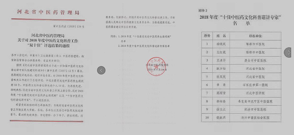 杨晓庆、王红霞被评为 河北省十佳中医药文化科普巡讲专家