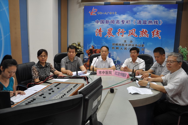 按照市民主评议办公室的安排,6月21日早晨,市中医院和河北工程大学附属医院领导共同走进邯郸广播电台“清晨行风热线栏目”直播间,参与节目的直播、解答听众的提问、接受群众的投诉。我院党委书记、院长高社光,党委副书记、副院长马登斌,副院长张恒云、王莉分别解答了听众朋友们的提问。