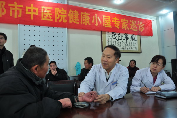 1月23日,市中医院高社光健康小屋专家团队,在院长高社光的带领下深入到华冶社区巡诊,当日,部分患者和专家就健康小屋工作接受了邯郸电视台两会走基层栏目的专访。上图为名中医高社光正在为患者把脉、问诊。(苏希国)