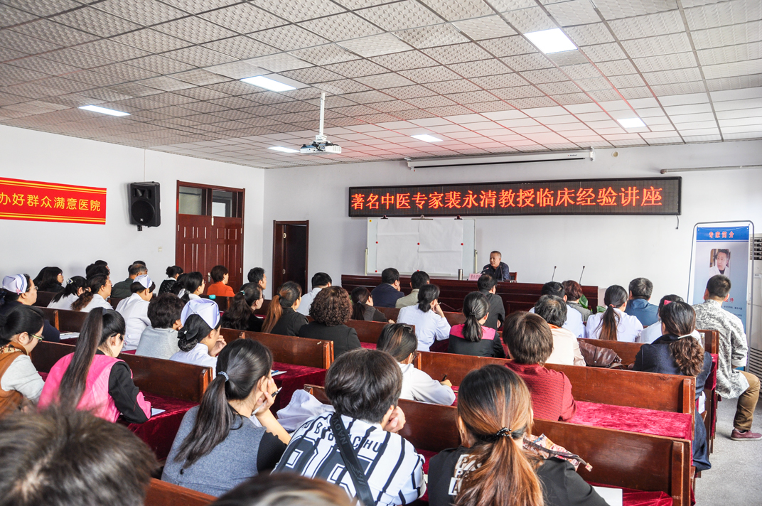 10月19日上午,我院特邀著名中医学家,北京中医药大学教授、主任医师、研究生导师裴永清教授来我院举行“裴永清教授临床经验“学术讲座。 裴永清教授行医40余年,研究生时代从师著名中医大师刘渡舟教授,深得真传。中医功底深厚、扎实,临床治疗范围广泛,疗效可靠,尤其对西医治疗上较棘手的疑难杂病多有独到的经验。临床擅治心脑血管疾病,在肝病的研究和治疗上有突出的贡献,对慢性支气管炎、冠心病、高血压、过敏性鼻炎、哮喘、心肌炎、慢性胃肠病、肝胆疾病、泌尿系疾病、妇女乳腺病、月经病、盆腔炎、附件炎、宫颈炎、更年期综合征、湿疹、痤疮、丹毒、痛风、早中期类风湿以及儿科杂病等疗效突出,被誉为“京城名医”。 本次讲座得到了市卫计委领导和院领导高度重视,胡书芬局长和各院领导亲临参加。除我院医务人员外,市区各兄弟医疗卫生单位也均派出医务人员到会。讲座现场气氛热烈,裴永清教授将理论知识与丰富的临床案例相结合,深入浅出的分析了自己宝贵的临床经验,并在会后耐心的解答了部分医务人员的提问。此次讲座不仅使我院医务人员领略了中医大师的风采,同时提高了我院临床医师中医诊疗的水平,取得了圆满成功。 (医务科)