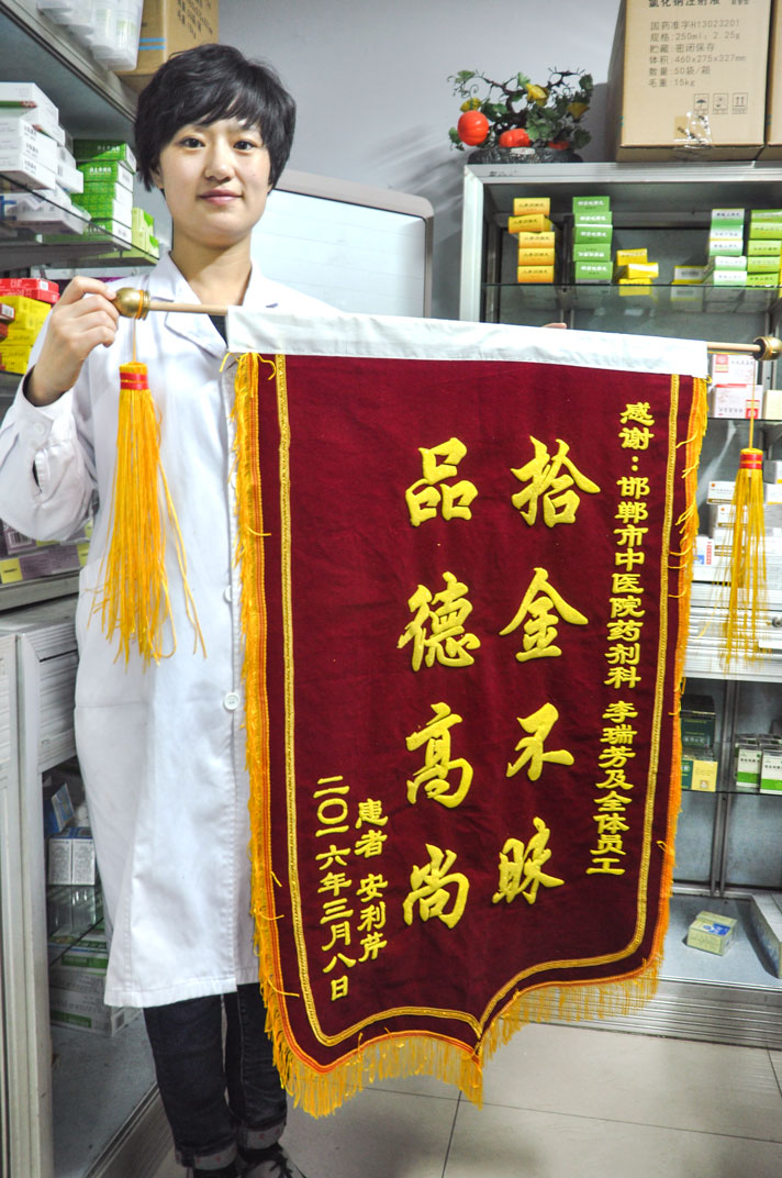 2016年3月8日下午3点左右,我院药剂科职工李瑞芳在门诊楼一层卫生间内捡到一个手提包,打开一看,发现里面装有药品,大量现金和一部全新手机,当时李瑞芳只有一个念头,这十之八九是患者的治病钱,一定要尽快将包交到失主手中。经过清点,包内有现金二万余元,无卡手机一部、大量药品以及若干纸片。可是手机内没有发现任何联系方式信息,只有几张纸片上模糊记录着一些电话。于是,她开始逐个拨打电话,一番努力后成功联系到了失主。4点左右,失主来到门诊大厅,李瑞芳找到导诊台的护士梁莹莹,一起为失主清点财物并亲手将包交到失主手中。失主接过失而复得的包显得意外而又惊喜,执意要重谢李瑞芳,李瑞芳说什么都不用,她说:“这是我应该做的,换成我们院任何一个人都会这样做的,让病人及时得到治疗,是我们共同的心愿”。原来,失主的姐姐长期患病,这一天她刚刚取出二万多的治病钱,准备来我院交住院费,谁知在慌忙中将手提包忘在了卫生间的衣帽钩上。多亏这救命的钱能及时找回,否则对她姐姐的病情真的是雪上加霜,为此失主特意送来表扬信和拾金不昧的锦旗。
