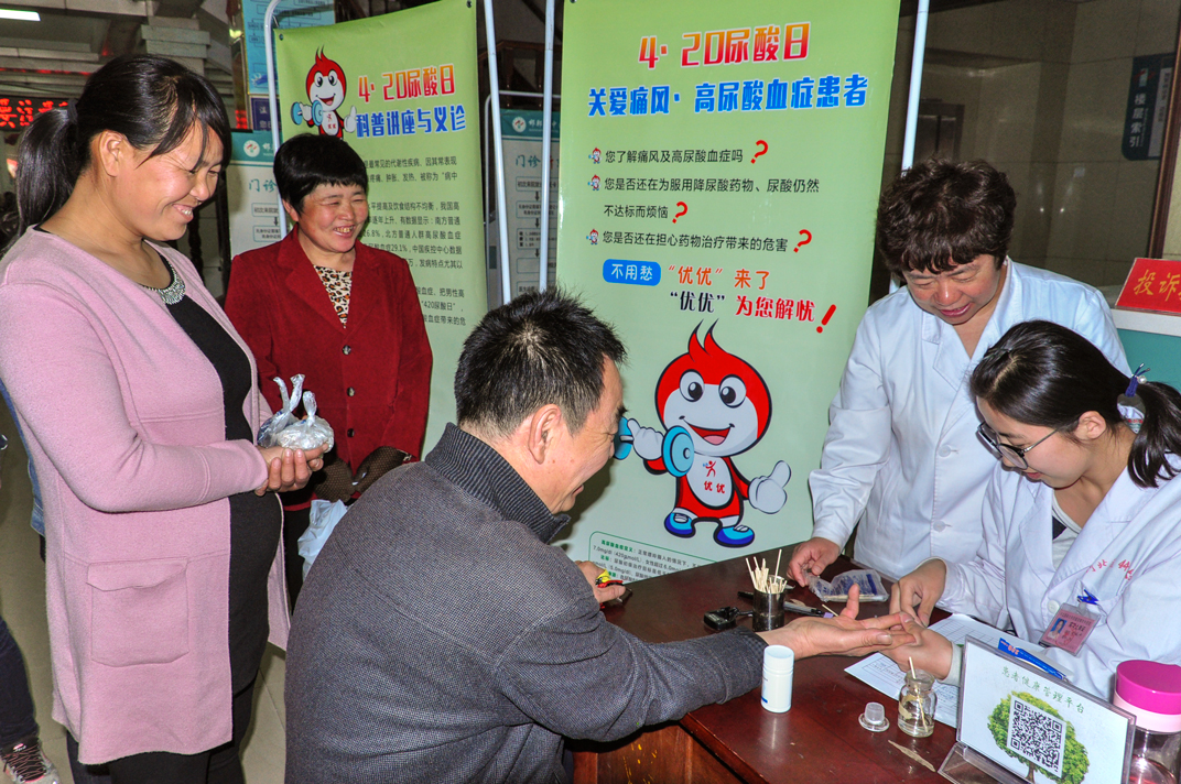4月20日,我院开展“4 20尿酸日”主题宣传活动,医院风湿病科组织专家在门诊大厅进行义诊,接受健康咨询,发放宣传资料,普及痛风及高尿酸血症的科普知识,并免费为咨询者进行尿酸值的测定。 痛风、高尿酸血症是最常见的代谢性疾病,常表现为关节突然出现的剧烈疼痛、肿胀、发热,近年来由于生活水平的提高及饮食结构不均衡,我国高尿酸血症及痛风发病率逐年上升,为了更好的帮助大家了解和关注高尿酸血症,把男性高尿酸血症的诊断标准420umol/L值定为“420尿酸日”,旨在让大家能更好的了解高尿酸血症带来的危害,进行早期预防和控制。(宣传科)
