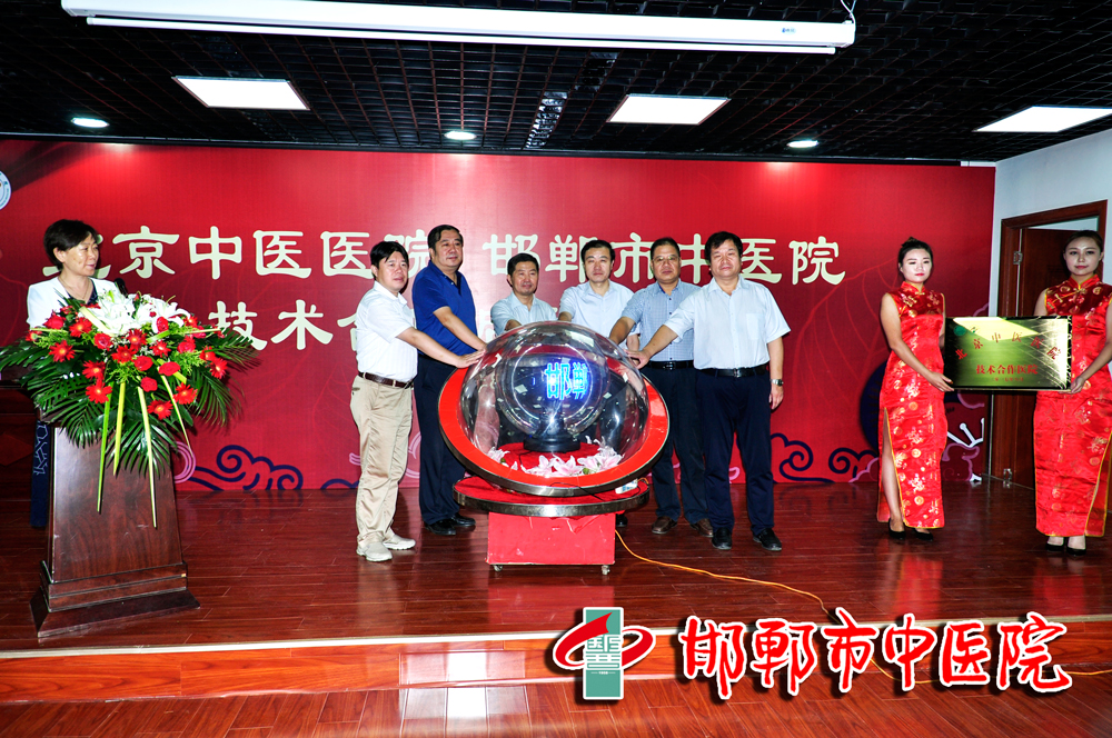 河北省中医药管理局副局长胡永平,邯郸市卫计委主任周海平, 北京中医医院常务副院长王大仟、院长助理王洪,邯郸市卫计委中医处处长张润海, 邯郸市中医院院长马登斌共同按下启动球,为“北京中医医院技术合作医院”揭牌