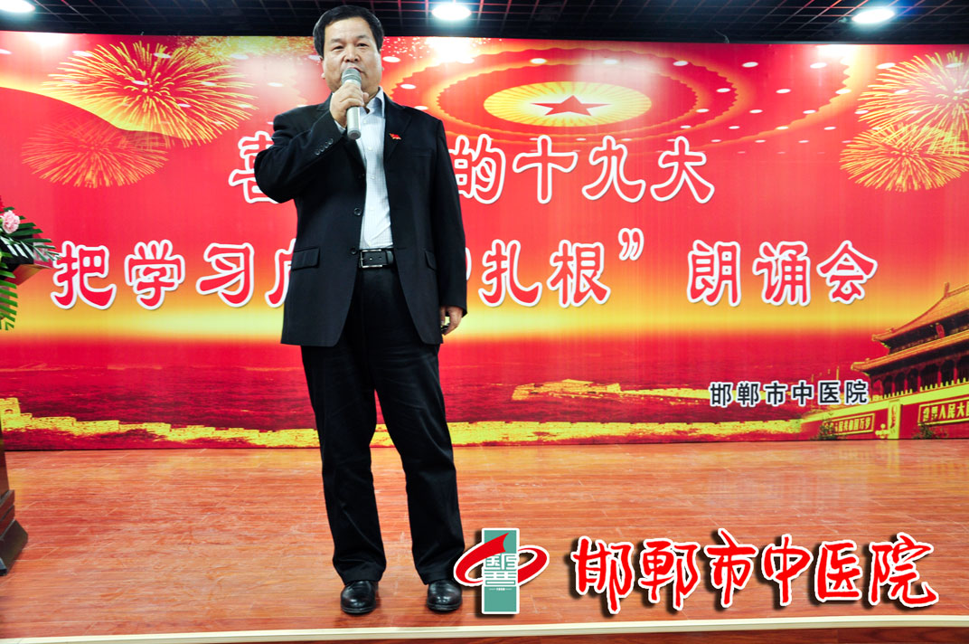 10月12日下午,我院在北区会议室召开喜迎党的十九大“把学习向信仰扎根”朗诵会。邯郸市朗诵演讲协会副主席葛宏冰,邯郸市卫计委组干处处长张鑫,邯郸广播电台总监刘云,邯郸市委宣传部文化出版处处长杜菡,我院马登斌院长和领导班子全体,及我院全体党员100余人参加了朗诵会。 来自我院各党支部及河北医科大学学生代表共12名朗诵者分别进行了精彩的朗诵,随后朗诵者们集体演唱了歌曲《歌唱祖国》。最后我院党委书记、院长马登斌同志进行了讲话,对朗诵会的成功举行表示了祝贺,这是我院喜迎十九大,向十九大献礼,号召全院党员干部凝心聚力谋发展的重要举措。