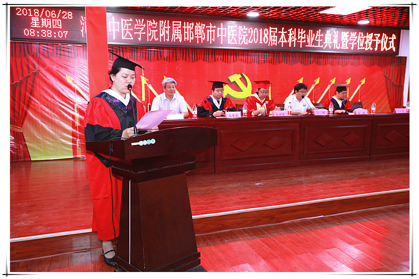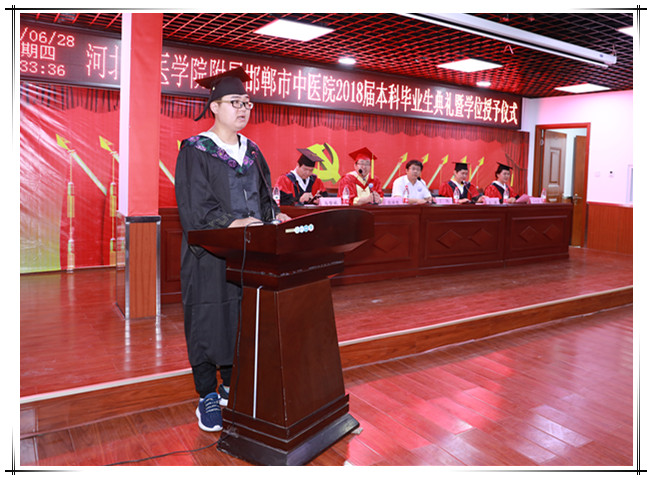 毕业典礼在悠扬的国歌中拉开序幕,邯郸市中医院党委书记、院长马登斌宣读了本科毕业生名单和学士学位授予决定。随后学生代表张永旺和教师代表王红霞副院长先后发言.